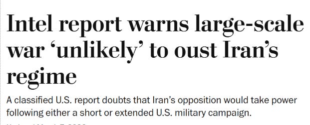 Here we are, beginning Week Two of what will either be a short war as Trump gets bored and sees how much attacking Iran threatens to topple his regime. Or we’re in for a years-long quagmire as Trump’s bloodlust intensifies and he commits tens of thousands of American troops to a suicidal course of action.