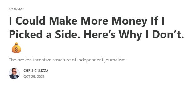 Chris Cillizza is auditioning for a new job. After being fired from CNN in 2022 for being too boring, Cillizza has been flipping through his Rolodex, hoping someone would give him another high-paying gig writing listicles and whitewashing fascism. He landed here on Substack because that’s where all the former news people run to when their careers derail.