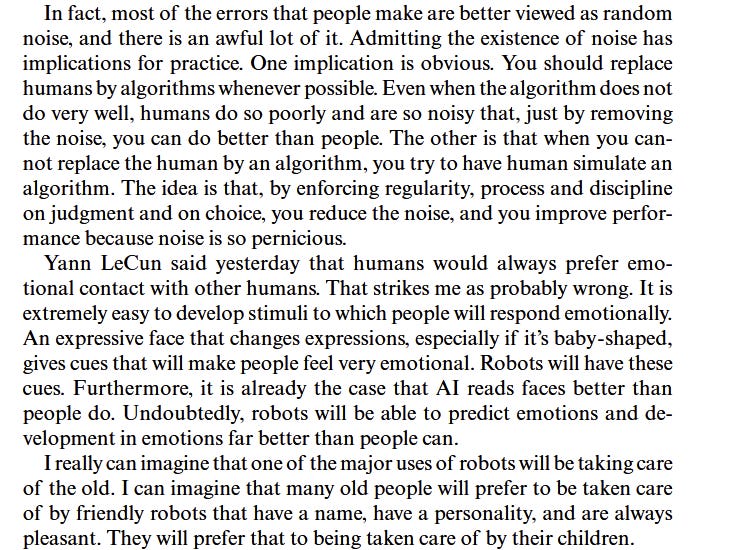 Physical care, emotional care, creative work — these are some of the hardest things humans do. They are also the most beautiful. (There is a separate essay to be written about the unequal burden of this care work, but also the galaxies of human experience so many men never visit). We un-human ourselves when we turn care and connection over to artificial intelligence because that feels easier, whether that’s having robots care for the old because human carers are too flawed, or asking robots to emotionally soothe us because the humans in our lives do not tell us precisely what we want to hear.