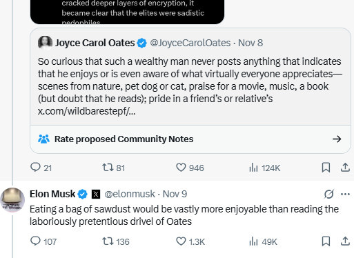 I really enjoy Musk swinging from basic schoolyard insults to “Grok, I am high on ketamine, please write an intelligent-sounding insult of Joyce Carol Oates for me.”