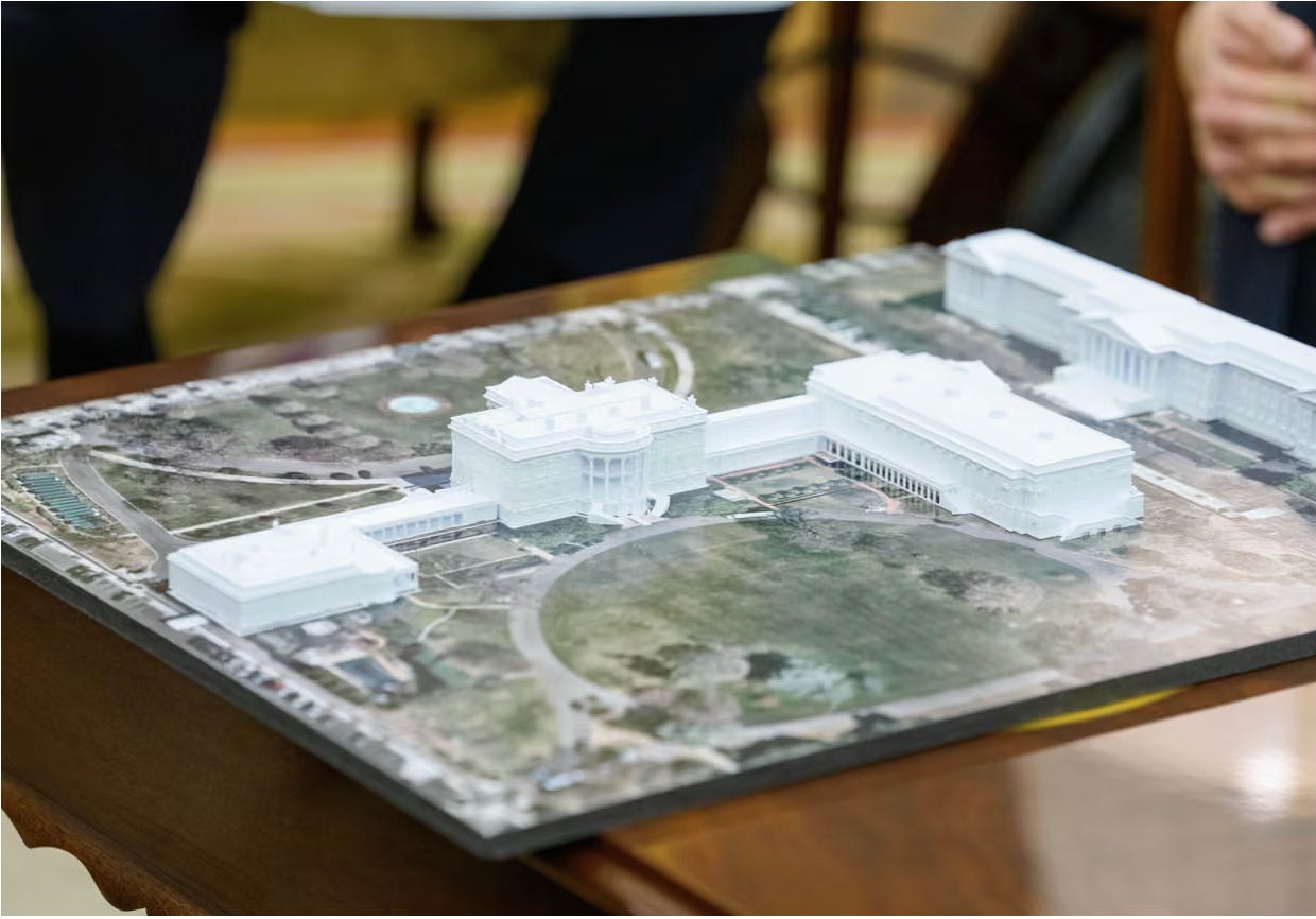 The ballroom dwarfs the primary White House residence. It feels quite visually unbalanced. It’s ugly. It’s tacky. It’s also reportedly going to be connected to the primary White House building by a glass bridge (ugh); it’s hard to imagine how one builds a glass bridge into the White House without making some significant changes to that structure, too. And it’s all about being built because an egomaniacal president wants to leave a huge mark that is all about him — even if the mark is a giant eyesore.