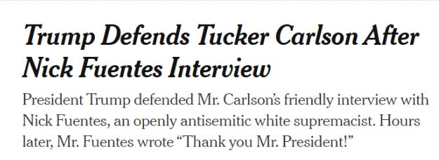 But they won’t because they haven’t done that since long before I was born, and I’m pretty fucking old.1 Instead, they will lurch to the right as they always do, insisting that if they could ONLY be more extreme, that would solve all of their problems. And who will be waiting to lead the way? Nick Fuentes and the neo-Nazis, because there is precious little room on the right left to lurch to.